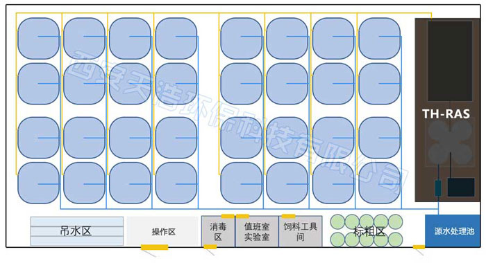 TH-RAS養殖循環水系統是西安天浩環保科技有限公司在經過多年的研究和實驗后推出的新系統,該系統的優勢就在于解決了能耗的問題。系統完全摒棄了傳統養殖水處理中使用的轉鼓微濾機、二氧化碳剝離器、蛋白分離器、增氧機、集污器等設備,因此占地面積減小。大量電力設備停止使用,使得養殖中能耗大幅降低,為企業節約費用。系統處理后排出的廢水中含有大量的有機物,通過排污管道儲存在污水池中,可以用于種植蔬菜,以此代替化學肥料,確保食用安全。